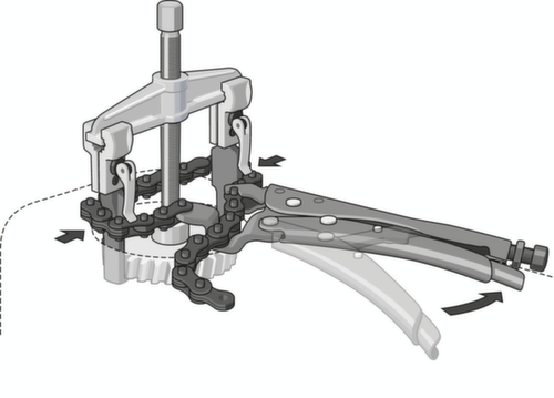"longDescription": "Particulièrement adapté au serrage de sections géométriquement difficiles, Avec No. 136 K-105, les crochets de différents extracteurs peuvent être enserrés et serrés avec la chaîne après avoir été bloqués sur la pièce à extraire. Ainsi, les crochets ne peuvent plus se plier vers l'extérieur et glisser. L'extracteur peut être utilisé même si la surface d'appui des crochets est très faible.<br>",