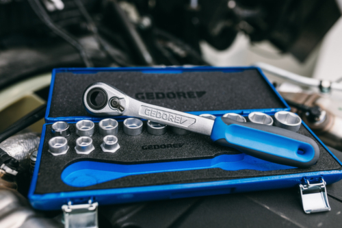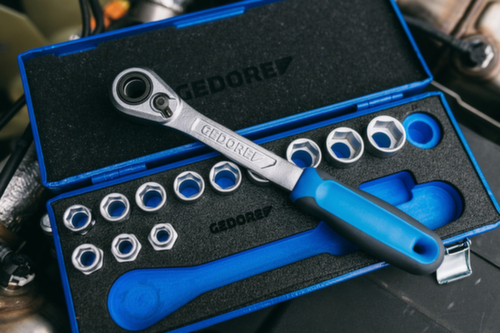 "longDescription": "Avec douilles forgées, trempées, à commande manuelle No. 19 SK à entraînement hexagonal extérieur, Avec cliquet réversible à levier robuste à entraînement hexagonal intérieur, Petite tête en forme de goutte pour les endroits de vissage les plus étroits, Denture fine, Angle de reprise 6°, Poignée bi-composant antidérapante avec trou de suspension, Dans coffret en tôle d'acier bleue GEDORE, Dimensions : 320 x 132 x 55 mm<br>",