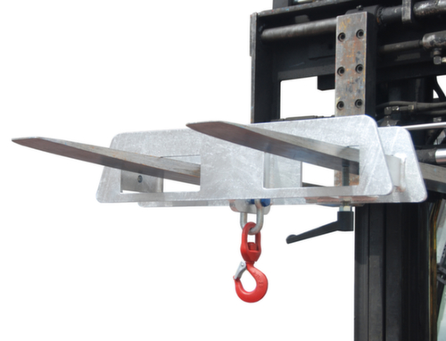 "longDescription": "<h2>Support pour crochet</h2><strong>Ramasser et transporter des charges en toute sécurité</strong><br><ul><li><strong>Système rapidement prêt à l'emploi</strong> - à accrocher aux dents de fourche du gerbeur</li><li><strong>Protection contre le glissement intempestif des dents de fourche</strong> grâce au dispositif de sécurité</li><li><strong>Soulèvement facile des charges</strong> grâce aux crochets à émerillon</li><li><strong>Robuste et durable</strong> - structure en acier stable</li></ul><br><h3>Le choix vous appartient :</h3><ul><li><strong>Design durable ou voyant</strong> - surface galvanisée à chaud ou avec laquage couleur</li><li>Pour soulever à l'aide d'une ou de deux dents de fourche</li><li>Convient au choix pour le levage par grue</li></ul>",