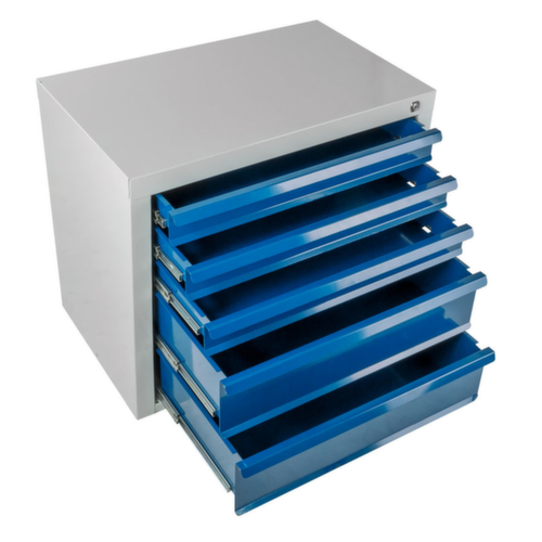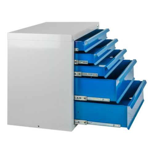 structure en acier. équipement des tiroirs : dimensions utiles tiroirs largeur x profondeur 570 x 338 mm, hauteur utile = hauteur frontale - 15 mm. force par tiroir 40 kg. L'extension totale garantit à 100 % un accès facile jusque dans le moindre recoin. tiroirs L'extension sur roulement à billes facilite l'ouverture et la fermeture du tiroir. avec Blocage d’extension. Le blocage permet d’éviter une extraction complète accidentelle de tous les tiroirs. verrouillable avec verrouillage centralisé. corps avec finition époxy résistante aux chocs et aux rayures en RAL7035 gris clair. face avant avec finition époxy résistante aux chocs et aux rayures en RAL 5012 bleu clair.