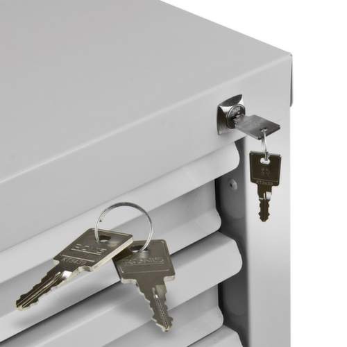 structure en acier. équipement des tiroirs : dimensions utiles tiroirs largeur x profondeur 570 x 338 mm, hauteur utile = hauteur frontale - 15 mm. force par tiroir 40 kg. L'extension totale garantit à 100 % un accès facile jusque dans le moindre recoin. L'extension sur roulement à billes facilite l'ouverture et la fermeture du tiroir. avec Blocage d’extension. Le blocage permet d’éviter une extraction complète accidentelle de tous les tiroirs. verrouillable avec verrouillage centralisé. corps avec finition époxy résistante aux chocs et aux rayures en RAL7035 gris clair. face avant avec finition époxy résistante aux chocs et aux rayures en RAL7035 gris clair.