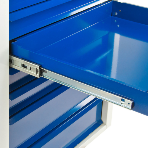 structure en acier. équipement des tiroirs : dimension utile tiroirs largeur x profondeur 570 x 405 mm. force par tiroir 30 kg. L'extension totale garantit à 100 % un accès facile jusque dans le moindre recoin. L'extension sur roulement à billes facilite l'ouverture et la fermeture du tiroir. avec Blocage d’extension. Le blocage permet d’éviter une extraction complète accidentelle de tous les tiroirs. verrouillable avec verrouillage centralisé. corps avec finition époxy résistante aux chocs et aux rayures en RAL7035 gris clair. face avant avec finition époxy résistante aux chocs et aux rayures en RAL 5012 bleu clair. La tablette est munie d'un tapis en caoutchouc. Le tapis antidérapant empêche le roulement ou la chute des objets posés dans l'armoire.