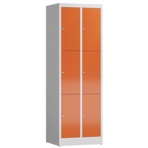 porte à battants. verrouillable avec serrure à cylindre. structure en acier, soudé. corps avec finition peinture époxy électrostatique en RAL7035 gris clair. face avant avec finition peinture époxy électrostatique en RAL3000 rouge vif.