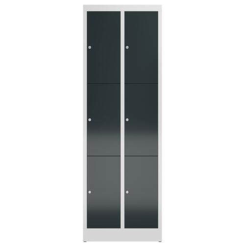 porte à battants. verrouillable avec serrure à cylindre. structure en acier, soudé. corps avec finition peinture époxy électrostatique en RAL7035 gris clair. face avant avec finition peinture époxy électrostatique en RAL7016 gris anthracite.