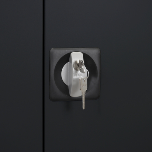 les principales dimensions de l’ armoire universelle en un coup d’œil :Fabriqué en acier. Grande flexibilité de l’aménagement intérieur grâce à la possibilité de régler la hauteur du compartiment par pas de 25 mm. équipé de tablettes. La porte à double battant facilite particulièrement l’accès au contenu de l’armoire. Les portes à fermeture encastrée à fleur du corps n’ont pas de bords saillants contre lesquels quelqu’un pourrait se cogner et ne permettent pas à la poussière se déposer. Chaque porte est équipée en série d'amortisseurs en caoutchouc insonorisants qui empêchent la porte de claquer même lorsqu'elle est fermée énergiquement. Cela favorise un environnement sonore agréable tout en protégeant l'armoire contre les dommages. verrouillable avec fermeture barre de poussée avec serrure à cylindre. Le verrouillage de sécurité à 2 points offre une grande stabilité et une protection anti-effraction efficace.