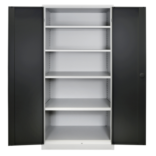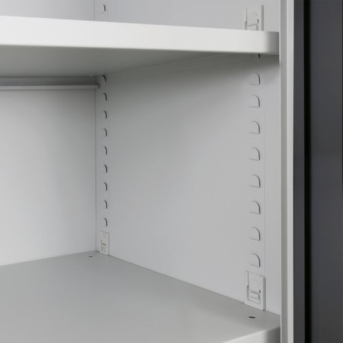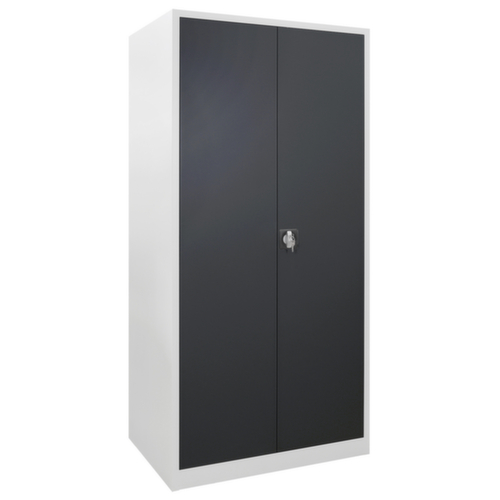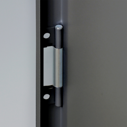 les principales dimensions de l’ armoire universelle en un coup d’œil :Fabriqué en acier. Grande flexibilité de l’aménagement intérieur grâce à la possibilité de régler la hauteur du compartiment par pas de 25 mm. équipé de tablettes. La porte à double battant facilite particulièrement l’accès au contenu de l’armoire. Les portes à fermeture encastrée à fleur du corps n’ont pas de bords saillants contre lesquels quelqu’un pourrait se cogner et ne permettent pas à la poussière se déposer. Chaque porte est équipée en série d'amortisseurs en caoutchouc insonorisants qui empêchent la porte de claquer même lorsqu'elle est fermée énergiquement. Cela favorise un environnement sonore agréable tout en protégeant l'armoire contre les dommages. verrouillable avec fermeture barre de poussée avec serrure à cylindre. Le verrouillage de sécurité à 2 points offre une grande stabilité et une protection anti-effraction efficace.