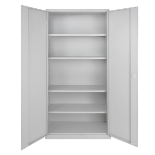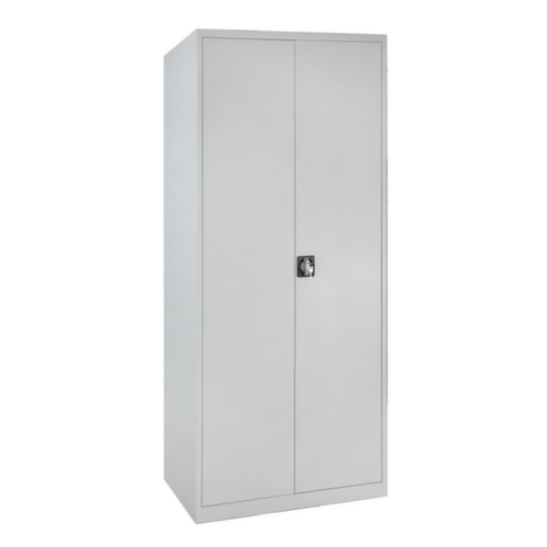 les principales dimensions de l’ armoire universelle en un coup d’œil :Fabriqué en acier. Grande flexibilité de l’aménagement intérieur grâce à la possibilité de régler la hauteur du compartiment par pas de 25 mm. équipé de tablettes. La porte à double battant facilite particulièrement l’accès au contenu de l’armoire. Les portes à fermeture encastrée à fleur du corps n’ont pas de bords saillants contre lesquels quelqu’un pourrait se cogner et ne permettent pas à la poussière se déposer. Chaque porte est équipée en série d'amortisseurs en caoutchouc insonorisants qui empêchent la porte de claquer même lorsqu'elle est fermée énergiquement. Cela favorise un environnement sonore agréable tout en protégeant l'armoire contre les dommages. verrouillable avec fermeture barre de poussée avec serrure à cylindre. Le verrouillage de sécurité à 2 points offre une grande stabilité et une protection anti-effraction efficace.