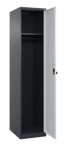 Les principales dimensions de C+P l’armoire vestiaire Classic Plus en un coup d’œil :par compartiment une tablette à chapeaux soudée au-dessus d’une tringle avec 3 doubles crochets coulissants anti-torsion. porte battante avec porte-étiquette et fentes d’aération. Les gonds intérieurs des portes battantes offrent l’avantage d’un visuel net, car aucune vis ou charnière n’est visible de l’extérieur. Le design de l’armoire n’est donc pas altéré et l’ensemble du meuble semble de meilleure qualité. La surface lisse est également plus facile à nettoyer, car aucun dépôt de saleté ou de poussière n’est à craindre aux endroits inaccessibles. Chaque porte est équipée de série d’un amortisseur, de sorte que, même fermée avec élan, elle ne claque pas. Cela contribue non seulement à améliorer l’environnement sonore, mais protège aussi l’armoire en acier des dommages. La structure BIONIC Steel Frame, inspirée de la nature, est une construction particulièrement efficace et stable. La structure interne raffinée composée de pliages, d’entretoises et d’espaces, ainsi que la plus grande épaisseur de matériau aux endroits cruciaux, comme à l’avant des parois latérales et dans les profilés de cloisons et de caissons, augmentent encore la rigidité. Verrouillable avec Porte-cadenas de sécurité pour cadenas. La serrure de sécurité est particulièrement résistante aux effractions puisqu’elle tourne en position verrouillée et se verrouille uniquement après le retrait de la serrure. Convient pour tous les cadenas avec une épaisseur d'anse de 6 - 8 mm. Les orifices de ventilation supplémentaires dans le compartiment, combinés aux fentes d’aération dans la porte, améliorent le flux d’air. L’intérieur de l’armoire est ainsi mieux ventilé et son contenu sèche plus vite, sans générer de mauvaises odeurs. Pour une apparence fine et un gain de place, l’armoire se pose directement au sol sans socle ni pieds. Des vis de mise à niveau assurent une pose sans vacillement en cas d’éventuelles irrégularités du sol. Le fond de l’armoire est galvanisé pour une protection anticorrosion améliorée. structure en acier, soudé de manière stable. Cela rend la structure particulièrement robuste et résistante, et donc plus durable. Les coins et les angles soudés du corps garantissent une plus grande étanchéité et donc une meilleure protection contre la poussière, l’humidité et la saleté qu’une structure vissée. En outre, il n’est pas nécessaire de procéder à des travaux d’entretien réguliers ni à des réajustements. corps avec thermolaquage en RAL7016 gris anthracite, face avant avec thermolaquage en RAL7035 gris clair.