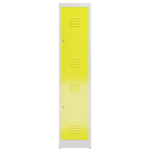 par compartiment 1 tringle et 2 doubles crochets par tablette. porte battante avec fentes d'aération. verrouillable avec serrure porte-cadenas pour cadenas. chaque compartiment à verrouillage individuel. Le socle encastré permet de répartir uniformément le poids de l’armoire sur le sol. Cela augmente la stabilité et l’armoire peut supporter des charges plus lourdes qu’une armoire à pieds. De plus, la saleté, la poussière et l’humidité ne peuvent pas s’infiltrer sous l’armoire, ce qui réduit la surface de nettoyage. structure en acier, soudé. corps avec finition peinture époxy électrostatique en RAL7035 gris clair, face avant avec finition peinture époxy électrostatique en RAL1018 jaune zinc.