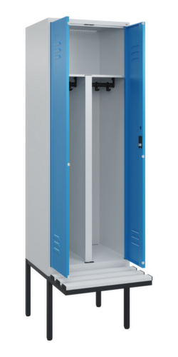 Les principales dimensions de C+P l’armoire vestiaire Classic Plus en un coup d’œil :par compartiment 1 tringle robuste à profil ovale avec 3 doubles crochets coulissants anti-torsion, au-dessus une tablette à chapeaux continue tous les 2 compartiments. Cette tablette extra large offre un espace de rangement idéal pour les EPI comme les casques, les protections oculaires ou auditives. porte à double battant avec fentes d’aération et porte-étiquette. Les gonds intérieurs des portes battantes offrent l’avantage d’un visuel net, car aucune vis ou charnière n’est visible de l’extérieur. Le design de l’armoire n’est donc pas altéré et l’ensemble du meuble semble de meilleure qualité. La surface lisse est également plus facile à nettoyer, car aucun dépôt de saleté ou de poussière n’est à craindre aux endroits inaccessibles. Chaque porte est équipée de série d’un amortisseur, de sorte que, même fermée avec élan, elle ne claque pas. Cela contribue non seulement à améliorer l’environnement sonore, mais protège aussi l’armoire en acier des dommages. La structure BIONIC Steel Frame, inspirée de la nature, est une construction particulièrement efficace et stable. La structure interne raffinée composée de pliages, d’entretoises et d’espaces, ainsi que la plus grande épaisseur de matériau aux endroits cruciaux, comme à l’avant des parois latérales et dans les profilés de cloisons et de caissons, augmentent encore la rigidité. verrouillable avec serrure à cylindre. Chaque personne dispose de 2 compartiments qui peuvent être verrouillés ensemble via des portes convergentes. Cela permet de séparer de manière simple et efficace les vêtements de travail et ceux de tous les jours. Les orifices de ventilation supplémentaires dans le compartiment, combinés aux fentes d’aération dans la porte, améliorent le flux d’air. L’intérieur de l’armoire est ainsi mieux ventilé et son contenu sèche plus vite, sans générer de mauvaises odeurs. Le banc suspendu offre plus d'espace libre pour s'habiller et se déshabiller confortablement, sans être gêné par le piètement. Les lames sont en plastique. Le piètement intégré réduit l'accumulation possible de la poussière et de la saleté en facilitant le nettoyage de toute la surface. Crée en plus un espace de rangement supplémentaire sous l'armoire. Les chaussures et les sacs ne sont plus dans le passage, et le risque de trébuchement est minimisé. structure en acier, soudé de manière stable. Cela rend la structure particulièrement robuste et résistante, et donc plus durable. Les coins et les angles soudés du corps garantissent une plus grande étanchéité et donc une meilleure protection contre la poussière, l’humidité et la saleté qu’une structure vissée. En outre, il n’est pas nécessaire de procéder à des travaux d’entretien réguliers ni à des réajustements. corps avec thermolaquage en RAL7035 gris clair, face avant avec thermolaquage en RAL 5012 bleu clair.