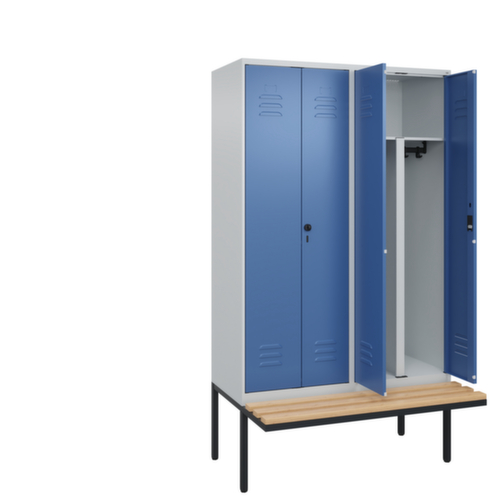 Les principales dimensions de C+P l’armoire vestiaire Classic Plus en un coup d’œil :par compartiment 1 tringle robuste à profil ovale avec 3 doubles crochets coulissants anti-torsion, au-dessus une tablette à chapeaux continue tous les 2 compartiments. Cette tablette extra large offre un espace de rangement idéal pour les EPI comme les casques, les protections oculaires ou auditives. porte à double battant avec fentes d’aération et porte-étiquette. Les gonds intérieurs des portes battantes offrent l’avantage d’un visuel net, car aucune vis ou charnière n’est visible de l’extérieur. Le design de l’armoire n’est donc pas altéré et l’ensemble du meuble semble de meilleure qualité. La surface lisse est également plus facile à nettoyer, car aucun dépôt de saleté ou de poussière n’est à craindre aux endroits inaccessibles. Chaque porte est équipée de série d’un amortisseur, de sorte que, même fermée avec élan, elle ne claque pas. Cela contribue non seulement à améliorer l’environnement sonore, mais protège aussi l’armoire en acier des dommages. La structure BIONIC Steel Frame, inspirée de la nature, est une construction particulièrement efficace et stable. La structure interne raffinée composée de pliages, d’entretoises et d’espaces, ainsi que la plus grande épaisseur de matériau aux endroits cruciaux, comme à l’avant des parois latérales et dans les profilés de cloisons et de caissons, augmentent encore la rigidité. verrouillable avec serrure à cylindre. Chaque personne dispose de 2 compartiments qui peuvent être verrouillés ensemble via des portes convergentes. Cela permet de séparer de manière simple et efficace les vêtements de travail et ceux de tous les jours. Les orifices de ventilation supplémentaires dans le compartiment, combinés aux fentes d’aération dans la porte, améliorent le flux d’air. L’intérieur de l’armoire est ainsi mieux ventilé et son contenu sèche plus vite, sans générer de mauvaises odeurs. Le banc suspendu offre plus d'espace libre pour s'habiller et se déshabiller confortablement, sans être gêné par le piètement. Les lames sont en bois de hêtre. Le piètement intégré réduit l'accumulation possible de la poussière et de la saleté en facilitant le nettoyage de toute la surface. Crée en plus un espace de rangement supplémentaire sous l'armoire. Les chaussures et les sacs ne sont plus dans le passage, et le risque de trébuchement est minimisé. structure en acier, soudé de manière stable. Cela rend la structure particulièrement robuste et résistante, et donc plus durable. Les coins et les angles soudés du corps garantissent une plus grande étanchéité et donc une meilleure protection contre la poussière, l’humidité et la saleté qu’une structure vissée. En outre, il n’est pas nécessaire de procéder à des travaux d’entretien réguliers ni à des réajustements. corps avec thermolaquage en RAL7035 gris clair, face avant avec thermolaquage en RAL5023 bleu distant.