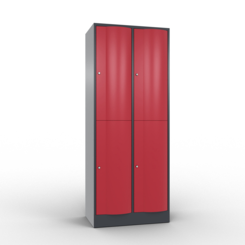 La porte battante convexe vers l’avant est absolument stable et résistante au vandalisme, même aux coups de pied. Les portes battantes sont montées sur des charnières robustes à espagnolettes internes et résistent ainsi à des sollicitations élevées. Chaque porte est équipée de série d’un amortisseur, de sorte que, même fermée avec élan, elle ne claque pas. Cela contribue non seulement à améliorer l’environnement sonore, mais protège aussi l’armoire en acier des dommages. De plus, la limitation d’ouverture de porte protège la porte contre l’extension excessive et contre le chevauchement de la surface utile avec l’armoire annexe. verrouillable avec serrure à cylindre. Les orifices de ventilation dans la paroi arrière assurent une bonne circulation de l’air dans chaque casier. Grâce au plateau supérieur, l’armoire à poser peut être utilisée comme surface de travail ou tablette supplémentaire. Le socle encastré permet de répartir uniformément le poids de l’armoire sur le sol. Cela augmente la stabilité et l’armoire peut supporter des charges plus lourdes qu’une armoire à pieds. De plus, la saleté, la poussière et l’humidité ne peuvent pas s’infiltrer sous l’armoire, ce qui réduit la surface de nettoyage. structure en tôle d'acier, soudé. corps avec thermolaquage. face avant avec thermolaquage.