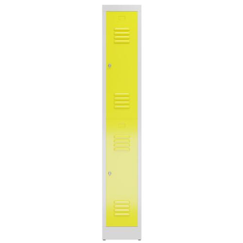 par compartiment 1 tringle et 2 doubles crochets par tablette. porte battante avec fentes d'aération. verrouillable avec serrure porte-cadenas pour cadenas. chaque compartiment à verrouillage individuel. Le socle encastré permet de répartir uniformément le poids de l’armoire sur le sol. Cela augmente la stabilité et l’armoire peut supporter des charges plus lourdes qu’une armoire à pieds. De plus, la saleté, la poussière et l’humidité ne peuvent pas s’infiltrer sous l’armoire, ce qui réduit la surface de nettoyage. structure en acier, soudé. corps avec finition peinture époxy électrostatique en RAL7035 gris clair, face avant avec finition peinture époxy électrostatique en RAL1018 jaune zinc.