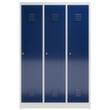 par compartiment 1 tablette à chapeaux et 1 tringle avec 4 doubles crochets. porte battante avec fentes d'aération. verrouillable avec serrure porte-cadenas pour cadenas. chaque compartiment à verrouillage individuel. Le socle encastré permet de répartir uniformément le poids de l’armoire sur le sol. Cela augmente la stabilité et l’armoire peut supporter des charges plus lourdes qu’une armoire à pieds. De plus, la saleté, la poussière et l’humidité ne peuvent pas s’infiltrer sous l’armoire, ce qui réduit la surface de nettoyage. structure en acier, soudé. corps avec finition peinture époxy électrostatique en RAL7035 gris clair, face avant avec finition peinture époxy électrostatique en RAL5010 bleu gentiane.