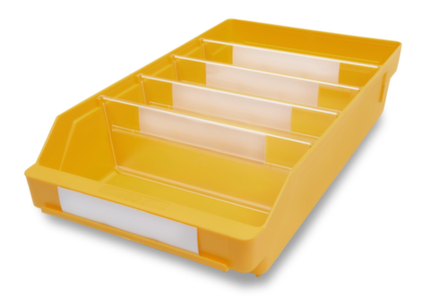 en polypropylène incassable, en jaune. guidages à encoches transversales et fixations au fond permettent de loger des séparateurs transversaux pour un compartimentage des bacs individuel. à bec. avec surface d'étiquetage. résistant à la température de -20 °C à +80 °C. matériau convient pour aliments.