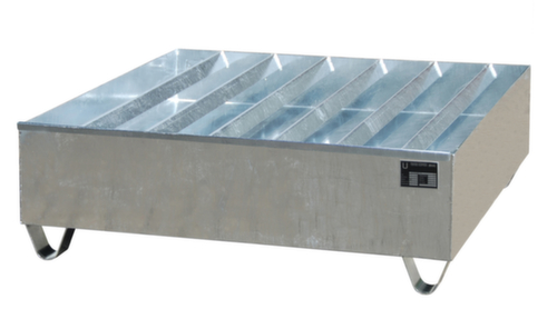 "metaDescription": "Bac de rétention gerbable avec caillebotis profilé - p. fût 4x200l, vol. rétention 410l, HxlxP 410x1200x1200mm, acier galvanisé",