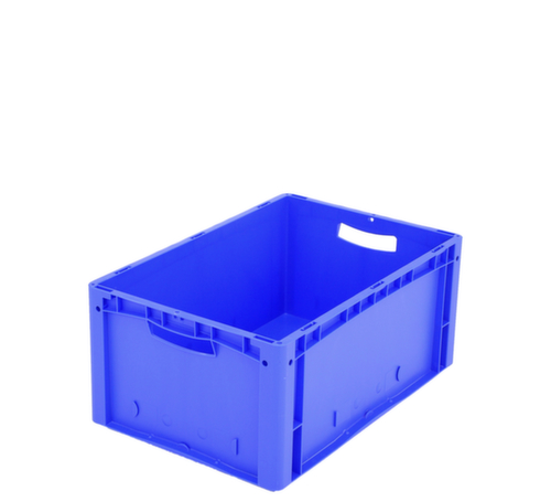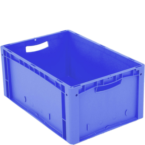 dimensions adaptées aux palettes européennes. en polypropylène incassable en bleu. Parois plein, fond double renfort. transport facile grâce à poignées. Plusieurs niveaux gerbable. convient pour aliments.