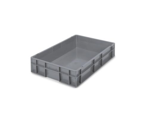 dimensions adaptées aux palettes européennes. en polypropylène incassable en gris. Parois plein, fond plein. transport facile grâce à ouvertures de prise fermées. Plusieurs niveaux gerbable. Adapté aux convoyeurs à rouleaux. Résistant à la température -10 °C à +80 °C. Recyclable.