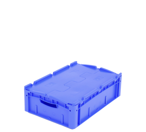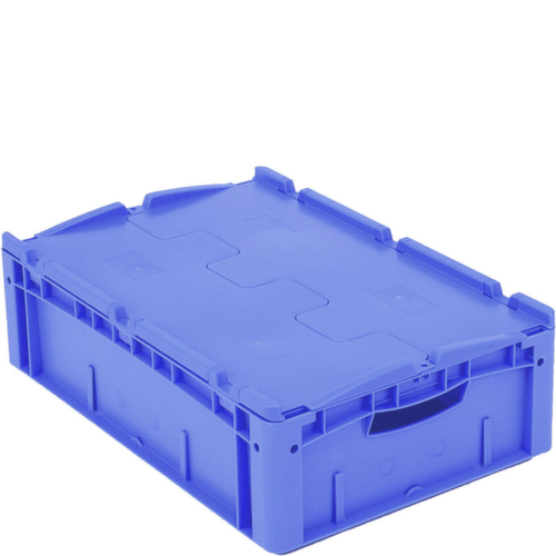 dimensions adaptées aux palettes européennes. en polypropylène incassable en bleu. Parois plein, fond plein. La marchandise stockée est protégée contre la poussière et la saleté grâce au couvercle à charnière en 2 parties. transport facile grâce à poignées ouvertes. Plusieurs niveaux gerbable. convient pour aliments.
