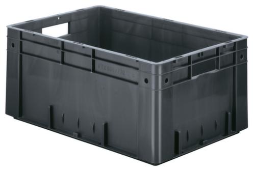 dimensions adaptées aux palettes européennes. en polypropylène incassable en gris. Parois plein sans ouverture de prise, fond plein. Fond avec renfort grâce à des rainures de renfort. transport facile grâce à poignées. avec porte-étiquettes sur tous les côtés. Plusieurs niveaux gerbable. convient pour aliments. Adapté aux convoyeurs à rouleaux. Convient pour différents tissus, nous consulter. recyclable.