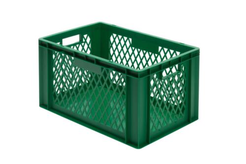 dimensions adaptées aux palettes européennes. en polypropylène incassable en vert. Parois ajourés, fond plein. transport facile grâce à poignées. Plusieurs niveaux gerbable. convient pour aliments. Adapté aux convoyeurs à rouleaux. Résistant à la température -20 °C à +80 °C. Convient pour différents tissus, nous consulter.