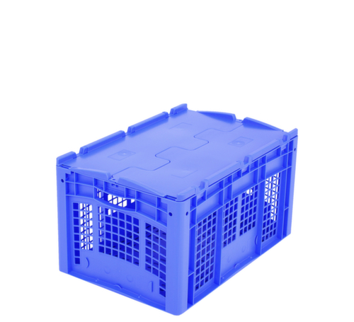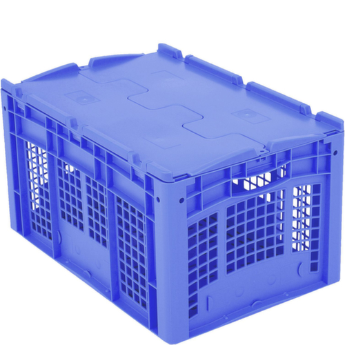 dimensions adaptées aux palettes européennes. en polypropylène incassable en bleu. Parois ajourés, fond ajourés. Fond avec renfort grâce à des nervures de renfort doubles. La marchandise stockée est protégée contre la poussière et la saleté grâce au couvercle à charnière en 2 parties. transport facile grâce à poignées ouvertes. Plusieurs niveaux gerbable. convient pour aliments.