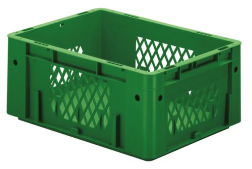 dimensions adaptées aux palettes européennes. en polypropylène incassable en vert. Parois ajourés sans ouverture de prise, fond plein. Fond avec renfort grâce à des rainures de renfort. transport facile grâce à poignées. avec porte-étiquettes sur tous les côtés. Plusieurs niveaux gerbable. convient pour aliments. Adapté aux convoyeurs à rouleaux. Convient pour différents tissus, nous consulter.