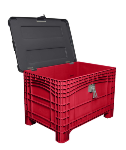 dimensions adaptées aux palettes européennes. en polyéthylène résistant aux chocs en rouge. La marchandise se stocke à l’abri de la poussière grâce aux parois fermées et le récipient se nettoie facilement, avec nervures de renfort. Le fond est fermé pour faciliter le nettoyage. Fermeture avec protection contre la poussière via couvercle à charnière. Manœuvre et déplacement aisés grâce à 4 roulettes pivotantes. Afin de pouvoir déplacer le bac, même rempli, ce dernier peut être manutentionné et il est également transportable au moyen d'engins de levage.
