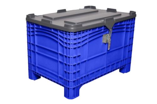 dimensions adaptées aux palettes européennes. en polyéthylène résistant aux chocs en bleu. La marchandise se stocke à l’abri de la poussière grâce aux parois fermées et le récipient se nettoie facilement, avec nervures de renfort. Le fond est fermé pour faciliter le nettoyage. Fermeture avec protection contre la poussière via couvercle à charnière. 4 pieds garantissent un support stable.