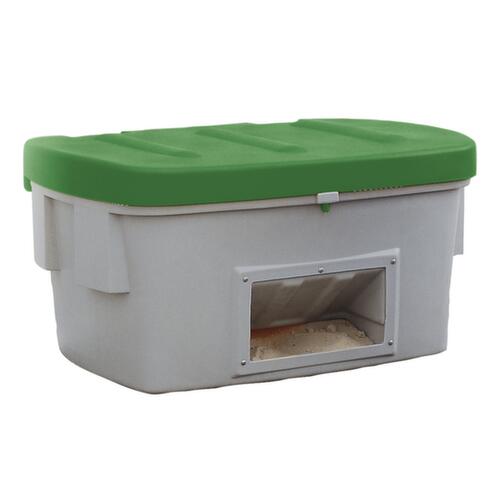 en polyéthylène résistant aux chocs. équipé de couvercle rabattable qui se démonte rapidement et facilement - sans le moindre outil. Verrouillable : grâce au dispositif de suspension, il est possible d’installer facultativement et aisément un cadenas sur le couvercle et sur le corps. Une protection contre un accès non autorisé est ainsi possible à tout moment. récipient gris, couvercle vert. parois plein avec ouverture pour retrait pratique. Il est ainsi possible de prélever le matériel en toute aisance sans avoir à ouvrir le couvercle. fond plein. Gerbages avec couvercle ouvert.