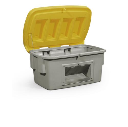 en polyéthylène résistant aux chocs. équipé de couvercle rabattable qui se démonte rapidement et facilement - sans le moindre outil. Verrouillable : grâce au dispositif de suspension, il est possible d’installer facultativement et aisément un cadenas sur le couvercle et sur le corps. Une protection contre un accès non autorisé est ainsi possible à tout moment. récipient gris, couvercle jaune. parois plein avec ouverture pour retrait pratique. Il est ainsi possible de prélever le matériel en toute aisance sans avoir à ouvrir le couvercle. fond plein. Gerbages avec couvercle ouvert.