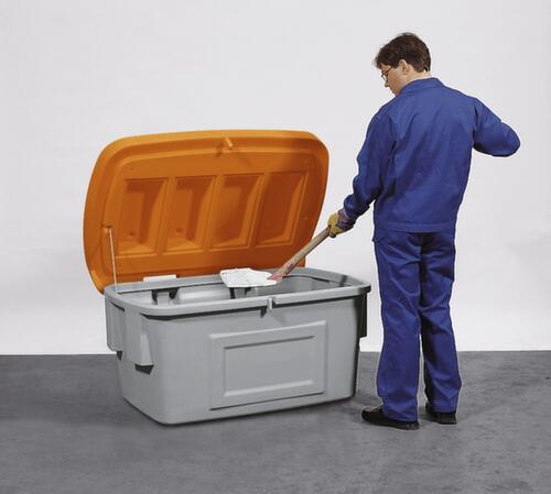 en polyéthylène résistant aux chocs. équipé de couvercle rabattable qui se démonte rapidement et facilement - sans le moindre outil. Verrouillable : grâce au dispositif de suspension, il est possible d’installer facultativement et aisément un cadenas sur le couvercle et sur le corps. Une protection contre un accès non autorisé est ainsi possible à tout moment. récipient gris, couvercle orange. parois plein - comme exécution sans ouverture pour retrait. Ceci contribue à accroître la robustesse du collecteur. fond plein. Gerbages avec couvercle ouvert.