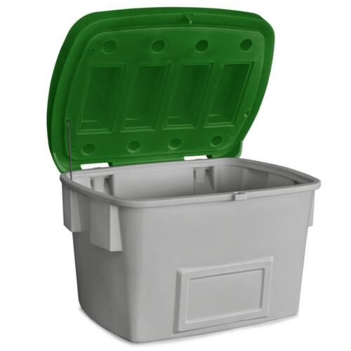 en polyéthylène résistant aux chocs. équipé de couvercle rabattable qui se démonte rapidement et facilement - sans le moindre outil. Verrouillable : grâce au dispositif de suspension, il est possible d’installer facultativement et aisément un cadenas sur le couvercle et sur le corps. Une protection contre un accès non autorisé est ainsi possible à tout moment. récipient gris, couvercle vert. parois plein - comme exécution sans ouverture pour retrait. Ceci contribue à accroître la robustesse du collecteur. fond plein. Gerbages avec couvercle ouvert.