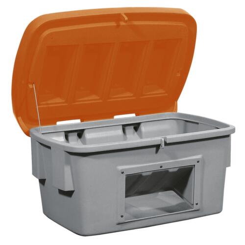 en polyéthylène résistant aux chocs. équipé de couvercle rabattable qui se démonte rapidement et facilement - sans le moindre outil. Verrouillable : grâce au dispositif de suspension, il est possible d’installer facultativement et aisément un cadenas sur le couvercle et sur le corps. Une protection contre un accès non autorisé est ainsi possible à tout moment. récipient gris, couvercle orange. parois plein avec ouverture pour retrait pratique. Il est ainsi possible de prélever le matériel en toute aisance sans avoir à ouvrir le couvercle. fond plein. Gerbages avec couvercle ouvert.