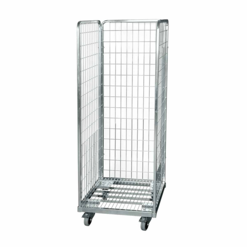 rehausses : 3 parois (grillagées). structure en acier galvanisé en bleu. plateforme en treillis. Manœuvre et déplacement aisés grâce à 4 roulettes pivotantes. Ø de roue 100 mm. avec bandage élastique préservant le sol. moyeu avec roulement à billes adapté pour un usage en continu. Les freins des 2 roulettes pivotantes assurent une bonne stabilité.