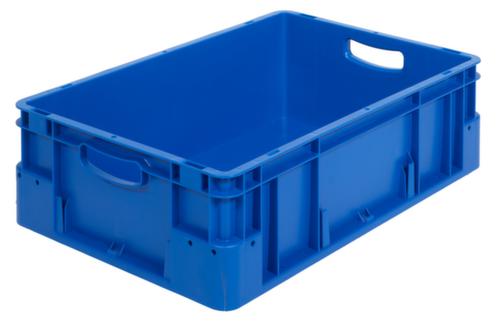 dimensions adaptées aux palettes européennes. en polypropylène incassable en bleu. Parois plein, fond plein. Fond avec renfort grâce à des rainures de renfort. transport facile grâce à poignées. avec porte-étiquettes pour une inscription individuelle et claire. facilement empilable avec rebord gerbable gerbable Plusieurs niveaux en toute sécurité. convient pour aliments. Adapté aux convoyeurs à rouleaux. Résistant à la température -40 °C à +90 °C. Convient pour différents tissus, nous consulter.