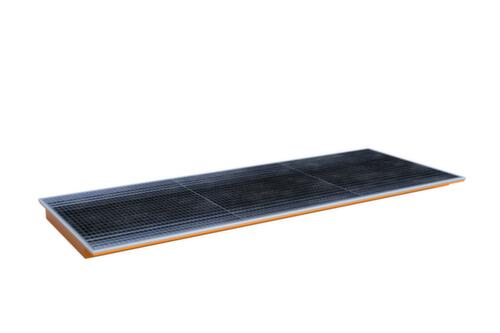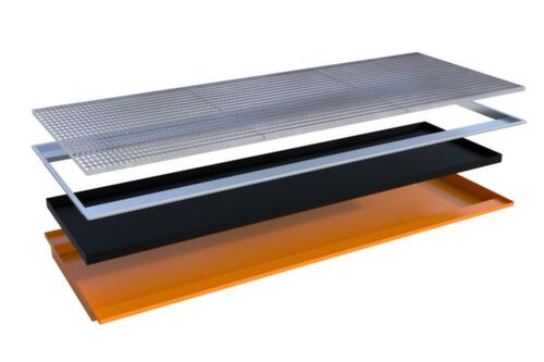 Rétrofitez les rayonnages à palettes ou d'autres rayonnages modulaires avec le bac de rétention à suspension en vue du stockage de produits dangereux, rapidement et conformément à la loi. Contrairement à d'autres bacs de rétention, le bac à suspension n'est pas posé sous le rayonnage, mais directement sur les traverses longitudinales comme niveau à part entière. La saillie sur les côtés longs forme une surface d'appui fiable. Le bac de rétention s'engage ainsi entre les traverses longitudinales et ne glisse pas.