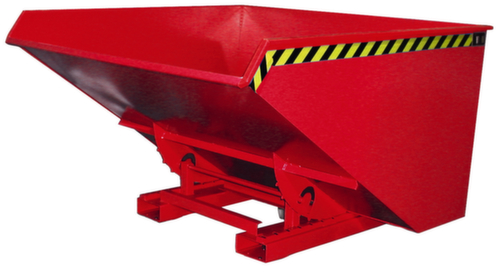 Le procédé de basculement est déclenché confortablement depuis le siège conducteur par déverrouillage du câble de traction. Les patins de protection garantissent un basculement en douceur grâce au centre de gravité avantageux de la charge. Après le vidage, la benne basculante retourne automatiquement à sa position initiale et la protection antibasculement se réenclenche automatiquement. Avec une chaîne de sécurité sur les fourreaux de fourche, la benne basculante peut également être fixée au gerbeur afin d’éviter qu’elle ne glisse . Grande stabilité grâce à des bords renforcés sur tout le pourtour et à un châssis stable. Structure robuste en acier avec laquage coloris RAL3000 rouge vif. Pour transporter et vider la benne basculante facilement, il suffit de la saisir avec le gerbeur via les fourreaux de fourche, puis de la placer à la position et à la hauteur souhaitées.
