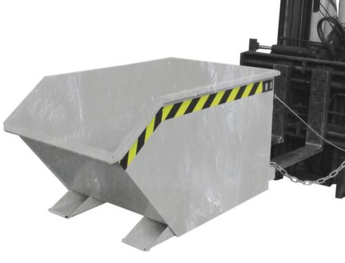 Les principales dimensions de la Bauer benne basculante en un coup d'œilLe procédé de basculement est déclenché confortablement depuis le siège conducteur par déverrouillage du câble de traction. La disposition particulière du pivot assure un angle de basculement avantageux et donc un vidage rapide et complet. La protection antibasculement garantit que la benne ne se renverse pas accidentellement pendant le transport. La benne basculante convient également pour la charge de liquides puisqu’elle est soudée de manière étanche à l’huile et à l’eau. Les liquides collectés, comme l’huile ou l’eau, sont séparés des matières solides par un tamis et peuvent être vidés rapidement via un robinet de vidange, sans devoir basculer le conteneur. parois plein. Grande stabilité grâce à des bords renforcés sur tout le pourtour et à un châssis stable. Utilisation mobile. Avec fourreaux pour fourche pour un transport facile.
