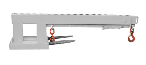 "longDescription": "<h2>Bras de grue télescopique</h2><strong>transforme le chariot élévateur en grue en peu de temps</strong><br><ul><li><strong>Maniement en toute sécurité</strong> - butée de sécurité délimitant la longueur maximale</li><li>Bras télescopique intérieur à 8 niveaux d'extension</li><li><strong>Soulèvement facile des charges</strong> grâce aux crochets à émerillon</li><li>Avec fourreaux de fourche pour les dents de fourche</li><li><strong>Protection contre le retrait et le glissement accidentels</strong> grâce à la chaîne de sécurité</li><li><strong>Robuste et durable</strong> - structure en acier stable</li></ul><br><h3>Le choix vous appartient :</h3><ul><li><strong>Design durable ou voyant</strong> - surface galvanisée à chaud ou avec laquage couleur</li></ul>",