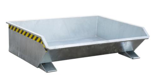 La benne basculante extrêmement basse convient parfaitement aux zones de travail restreintes, comme récipient d'appoint sur une machine ou directement sous l'éjecteur de la machine.