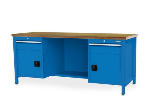 piètement 4 pieds. Équipement : 2 tiroirs, 2 armoires, 1/2 tablette. À gauche 1 tiroir, 1 armoire. centre 1/2 tablette. À droite 1 tiroir, 1 armoire. hauteur des tiroirs 2x150 mm. dimension utile tiroirs largeur x profondeur 600 x 600 mm. force par tiroir 100 kg. tiroirs avec glissière à galets avec roulements à billes, extension 100 %. tiroirs tiroirs avec fentes pour l’insertion de matériel de compartimentage. avec Le blocage d'extension individuel empêche l'ouverture simultanée de plusieurs tiroirs et, par là même, un basculement. poignée barre. bandes d'inscription. verrouillable avec serrure à cylindre. structure en acier.