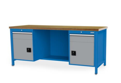 piètement 4 pieds. Équipement : 2 tiroirs, 2 armoires, 1/2 tablette. À gauche 1 tiroir, 1 armoire. centre 1/2 tablette. À droite 1 tiroir, 1 armoire. hauteur des tiroirs 2x150 mm. dimension utile tiroirs largeur x profondeur 600 x 600 mm. force par tiroir 100 kg. tiroirs avec glissière à galets avec roulements à billes, extension 100 %. tiroirs tiroirs avec fentes pour l’insertion de matériel de compartimentage. avec Le blocage d'extension individuel empêche l'ouverture simultanée de plusieurs tiroirs et, par là même, un basculement. poignée barre. bandes d'inscription. verrouillable avec serrure à cylindre. structure en acier.