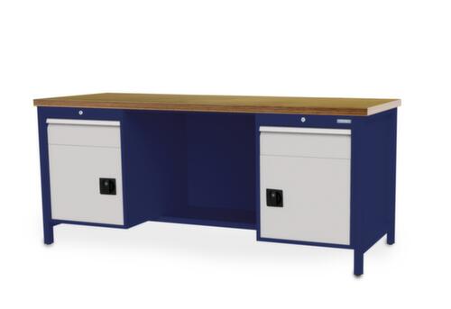piètement 4 pieds. Équipement : 2 tiroirs, 2 armoires, 1/2 tablette. À gauche 1 tiroir, 1 armoire. centre 1/2 tablette. À droite 1 tiroir, 1 armoire. hauteur des tiroirs 2x150 mm. dimension utile tiroirs largeur x profondeur 600 x 600 mm. force par tiroir 100 kg. tiroirs avec glissière à galets avec roulements à billes, extension 100 %. tiroirs tiroirs avec fentes pour l’insertion de matériel de compartimentage. avec Le blocage d'extension individuel empêche l'ouverture simultanée de plusieurs tiroirs et, par là même, un basculement. poignée barre. bandes d'inscription. verrouillable avec serrure à cylindre. structure en acier.
