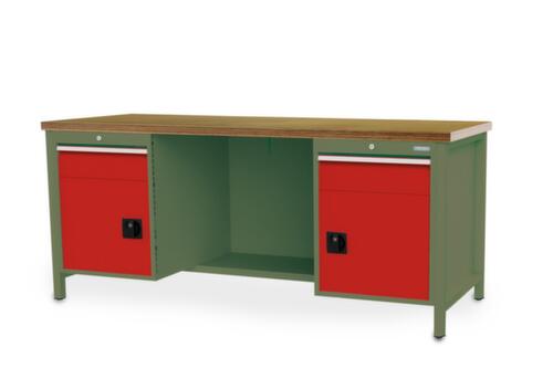 piètement 4 pieds. Équipement : 2 tiroirs, 2 armoires, 1/2 tablette. À gauche 1 tiroir, 1 armoire. centre 1/2 tablette. À droite 1 tiroir, 1 armoire. hauteur des tiroirs 2x150 mm. dimension utile tiroirs largeur x profondeur 600 x 600 mm. force par tiroir 100 kg. tiroirs avec glissière à galets avec roulements à billes, extension 100 %. tiroirs tiroirs avec fentes pour l’insertion de matériel de compartimentage. avec Le blocage d'extension individuel empêche l'ouverture simultanée de plusieurs tiroirs et, par là même, un basculement. poignée barre. bandes d'inscription. verrouillable avec serrure à cylindre. structure en acier.