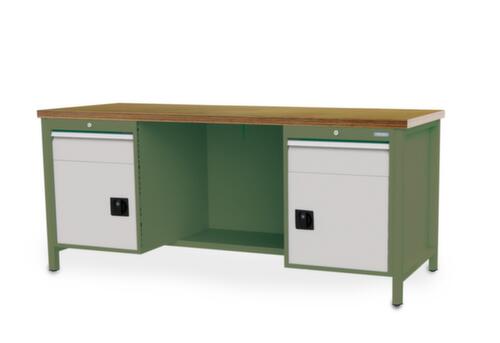 piètement 4 pieds. Équipement : 2 tiroirs, 2 armoires, 1/2 tablette. À gauche 1 tiroir, 1 armoire. centre 1/2 tablette. À droite 1 tiroir, 1 armoire. hauteur des tiroirs 2x150 mm. dimension utile tiroirs largeur x profondeur 600 x 600 mm. force par tiroir 100 kg. tiroirs avec glissière à galets avec roulements à billes, extension 100 %. tiroirs tiroirs avec fentes pour l’insertion de matériel de compartimentage. avec Le blocage d'extension individuel empêche l'ouverture simultanée de plusieurs tiroirs et, par là même, un basculement. poignée barre. bandes d'inscription. verrouillable avec serrure à cylindre. structure en acier.
