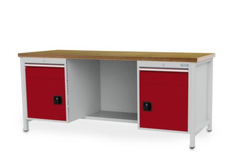 piètement 4 pieds. Équipement : 2 tiroirs, 2 armoires, 1/2 tablette. À gauche 1 tiroir, 1 armoire. centre 1/2 tablette. À droite 1 tiroir, 1 armoire. hauteur des tiroirs 2x150 mm. dimension utile tiroirs largeur x profondeur 600 x 600 mm. force par tiroir 100 kg. tiroirs avec glissière à galets avec roulements à billes, extension 100 %. tiroirs tiroirs avec fentes pour l’insertion de matériel de compartimentage. avec Le blocage d'extension individuel empêche l'ouverture simultanée de plusieurs tiroirs et, par là même, un basculement. poignée barre. bandes d'inscription. verrouillable avec serrure à cylindre. structure en acier.