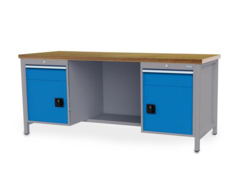 piètement 4 pieds. Équipement : 2 tiroirs, 2 armoires, 1/2 tablette. À gauche 1 tiroir, 1 armoire. centre 1/2 tablette. À droite 1 tiroir, 1 armoire. hauteur des tiroirs 2x150 mm. dimension utile tiroirs largeur x profondeur 600 x 600 mm. force par tiroir 100 kg. tiroirs avec glissière à galets avec roulements à billes, extension 100 %. tiroirs tiroirs avec fentes pour l’insertion de matériel de compartimentage. avec Le blocage d'extension individuel empêche l'ouverture simultanée de plusieurs tiroirs et, par là même, un basculement. poignée barre. bandes d'inscription. verrouillable avec serrure à cylindre. structure en acier.