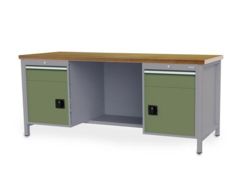 piètement 4 pieds. Équipement : 2 tiroirs, 2 armoires, 1/2 tablette. À gauche 1 tiroir, 1 armoire. centre 1/2 tablette. À droite 1 tiroir, 1 armoire. hauteur des tiroirs 2x150 mm. dimension utile tiroirs largeur x profondeur 600 x 600 mm. force par tiroir 100 kg. tiroirs avec glissière à galets avec roulements à billes, extension 100 %. tiroirs tiroirs avec fentes pour l’insertion de matériel de compartimentage. avec Le blocage d'extension individuel empêche l'ouverture simultanée de plusieurs tiroirs et, par là même, un basculement. poignée barre. bandes d'inscription. verrouillable avec serrure à cylindre. structure en acier.