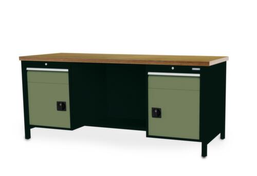 piètement 4 pieds. Équipement : 2 tiroirs, 2 armoires, 1/2 tablette. À gauche 1 tiroir, 1 armoire. centre 1/2 tablette. À droite 1 tiroir, 1 armoire. hauteur des tiroirs 2x150 mm. dimension utile tiroirs largeur x profondeur 600 x 600 mm. force par tiroir 100 kg. tiroirs avec glissière à galets avec roulements à billes, extension 100 %. tiroirs tiroirs avec fentes pour l’insertion de matériel de compartimentage. avec Le blocage d'extension individuel empêche l'ouverture simultanée de plusieurs tiroirs et, par là même, un basculement. poignée barre. bandes d'inscription. verrouillable avec serrure à cylindre. structure en acier.